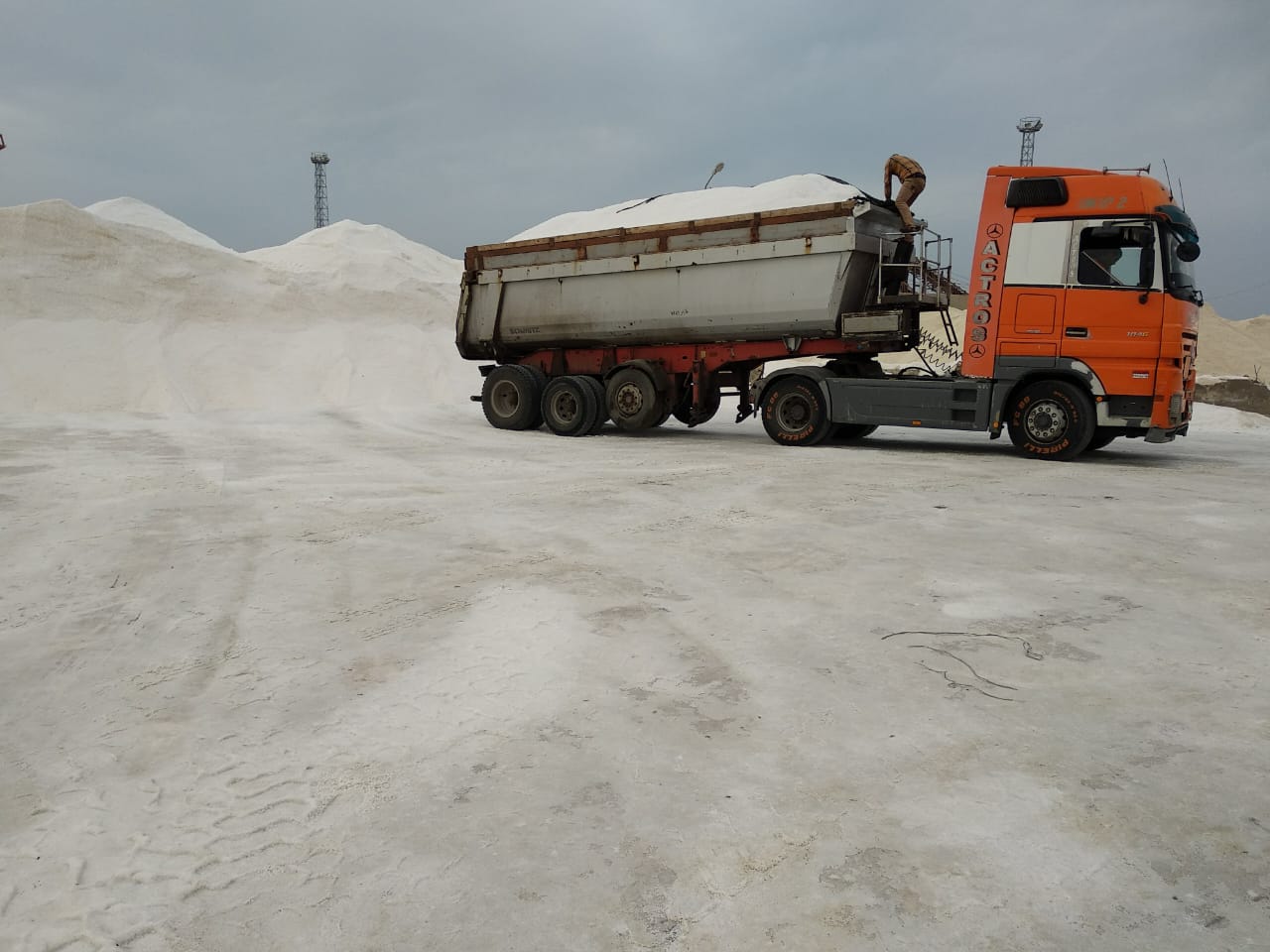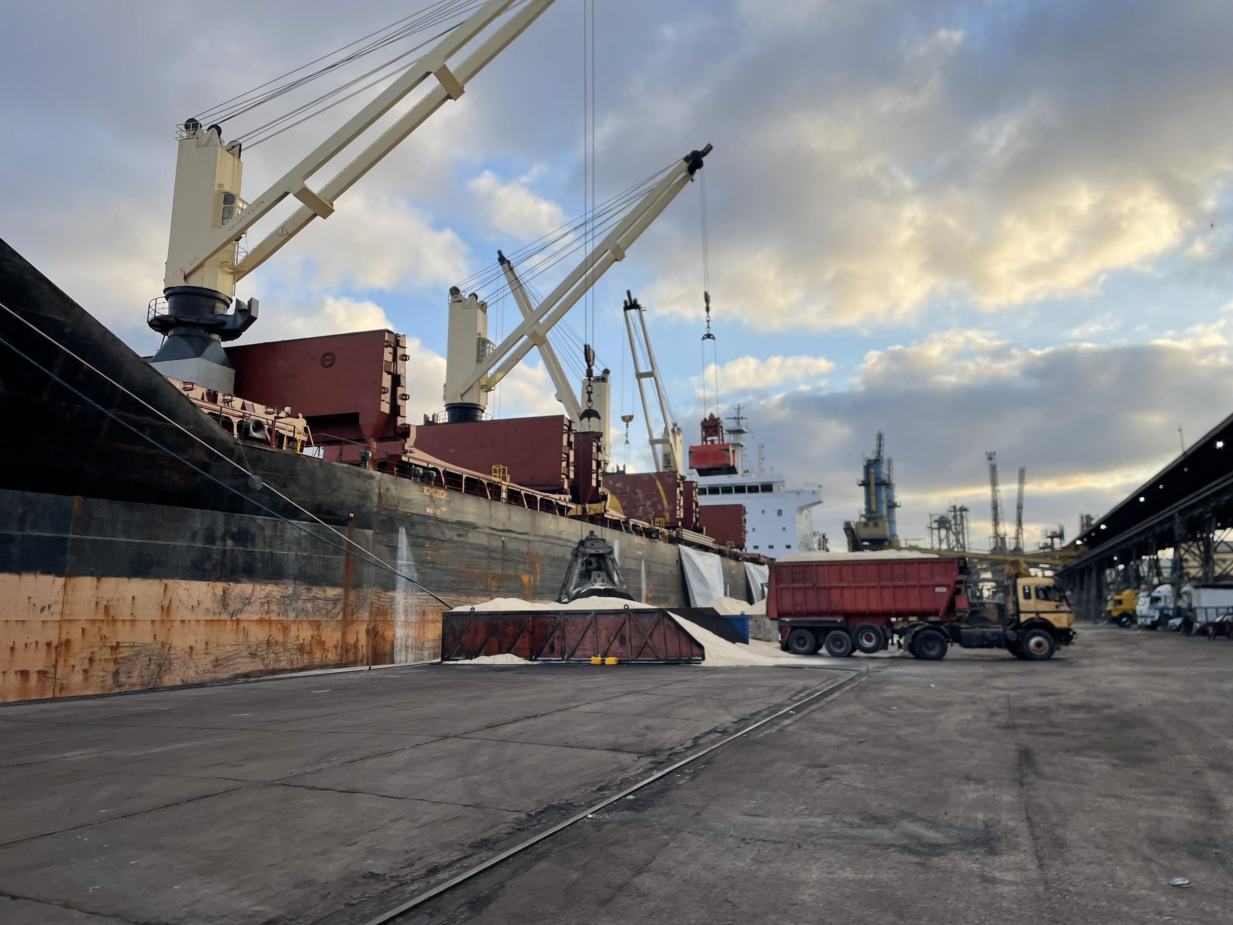 Salt is transferred from trucks to vessels at the port.
